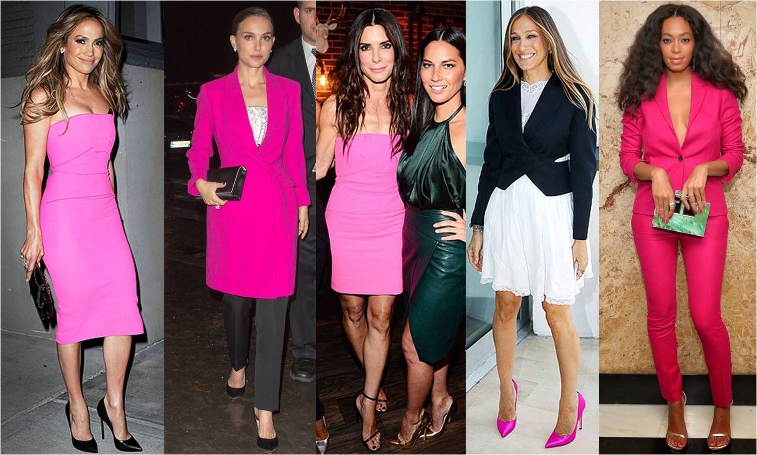 There are endless possibilities for how incorporate the vivid trend into your summer wardrobe. Take Sandra Bullock and Jennifer Lopez , who both go full-on with the hot pink in sexy sleeveless Roland Mouret dresses. Or Sarah Jessica Parker, who adds just a touch on the look with a pair of SJP Collection pumps (available at Nordstrom), which looks super cool worn with a little white dress and a black blazer. Natalie Portman shows how it can be done in a more elegant way for evening with a long fuchsia Dior coat over skinny black pants. And Solange Knowles takes on the colour in a brave and chic way with a vibrant Gucci pants suit – and it doesn’t get much more fun and fresh than that.