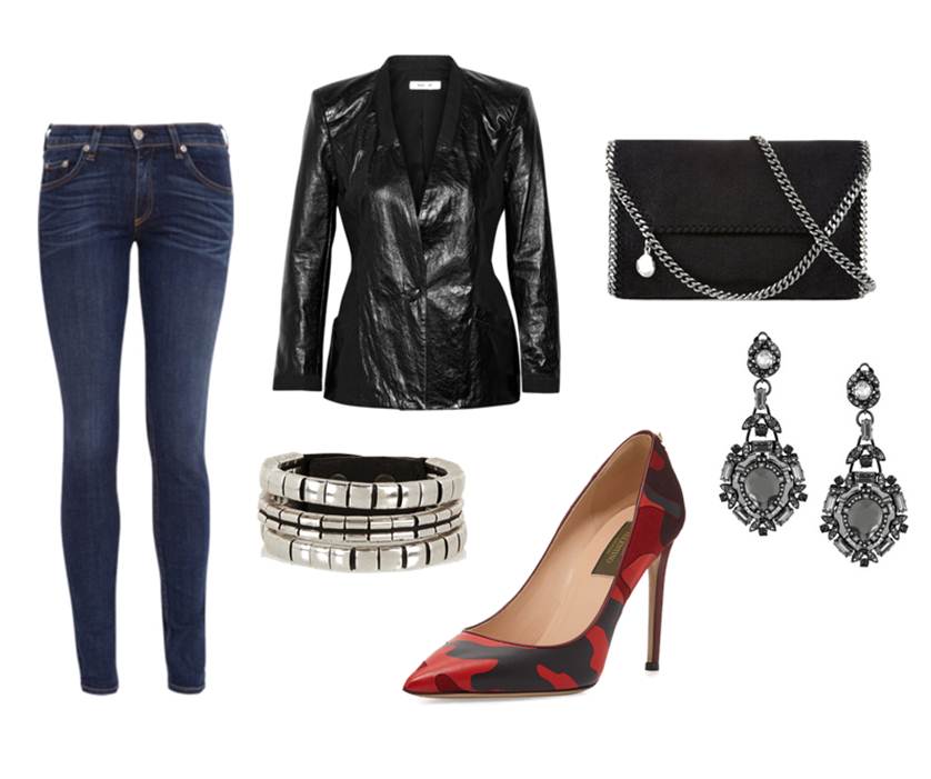 For a cool outfit during a night out with friends, camo heels look aweome and current with a favourite pair a dark skinny jeans. Pair it with a good looking black blazer, a great bag and some killer statement earrings and a cool bracelet. Clockwise from left: Rag & bone mid-rise skinny jeans ($225); Helmut Lang paneled leather blazer ($520); Stella McCartney faux-leather cross-body bag ($935); Lanvin Iconic gunmetal-tone, crystal and mirror clip earrings ($1,895); Valentino patchwork camo pump ($1,340); Isabel Marant Silver-tone leather bracelet ($310).