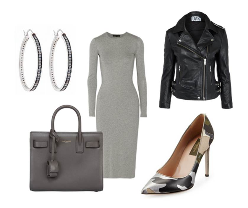 For a fancy weekend look, camo heels also look super chic with a simple good looking long sleeve dress. Wear it with a fancy sturctured bag, a biker jacket (a wardrobe staple) and some dismond hoops to balance it all out. Clockwise from left: J/Hadley Jewelry pave hoops ($1,425); The Row Nitan jersey midi dress ($660); Oak black leather biker jacket ($870); Valentino Patchwork camo pump ($1,450); Saint Laurent leather shoulder bag ($2,225).