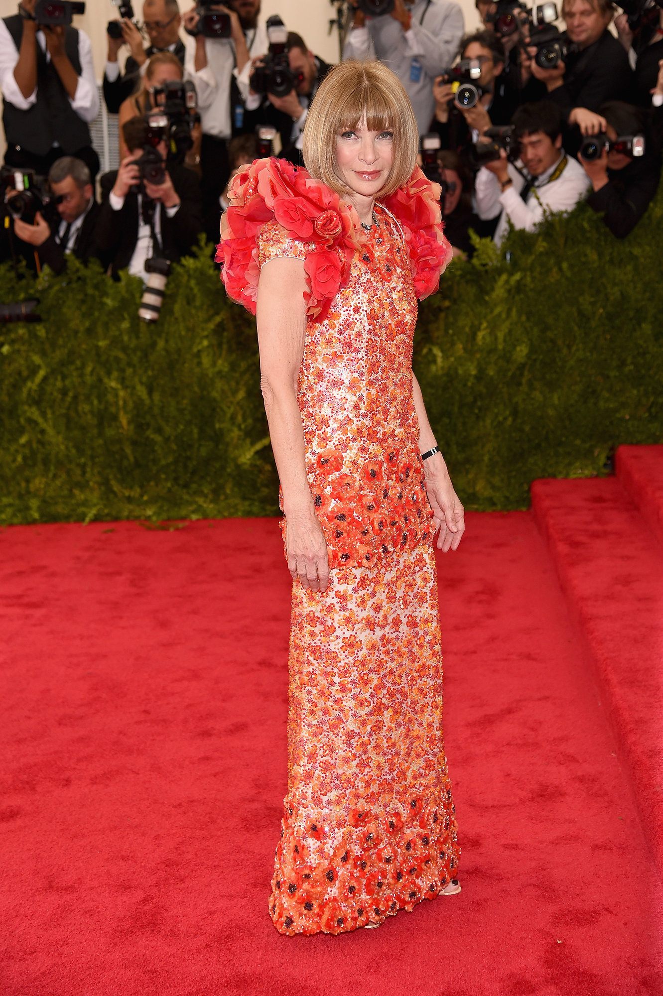 From Chanel’s spring 2015 Haute Couture collection, the intricate dress with petal-adorned statement sleeves was perfect on the iconic fashion editor and the most powerful person of the night. It honestly is her party.