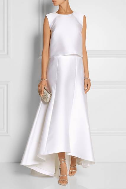 A two-piece ensemble, like this one from Adam Lippes, also works well for an alternative wedding look. It’s a nice way to achieve something less structured with movement. And the asymmetrical skirt is made for showing off statement-making shoes. You find Adam Lippes’ designs on net-a-porter.com.